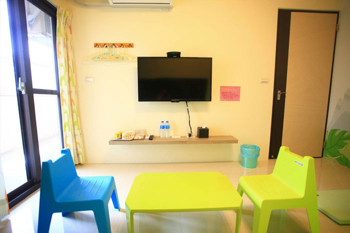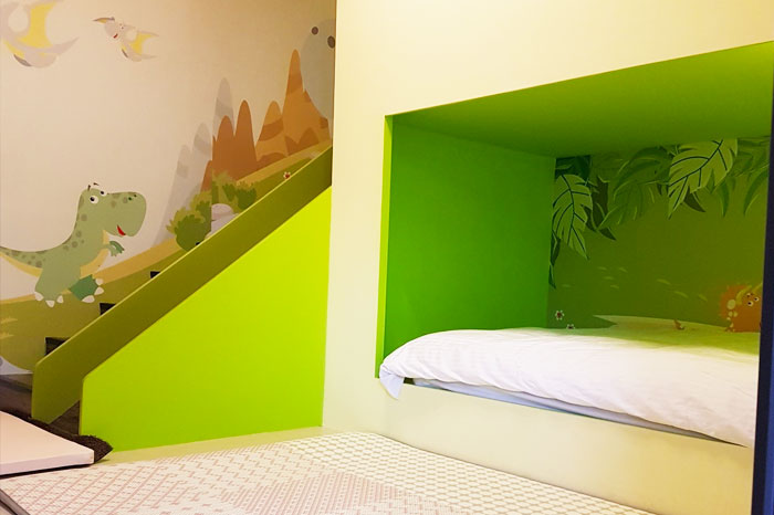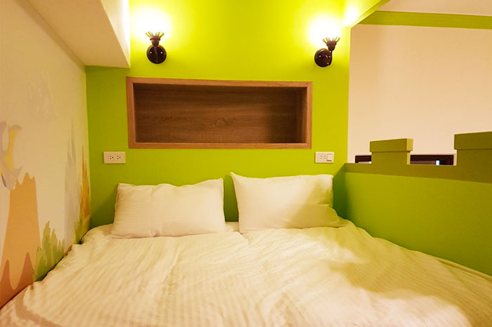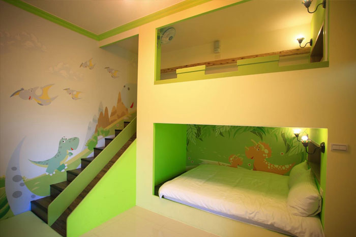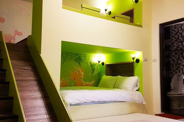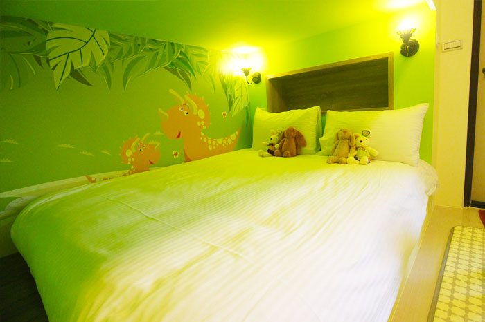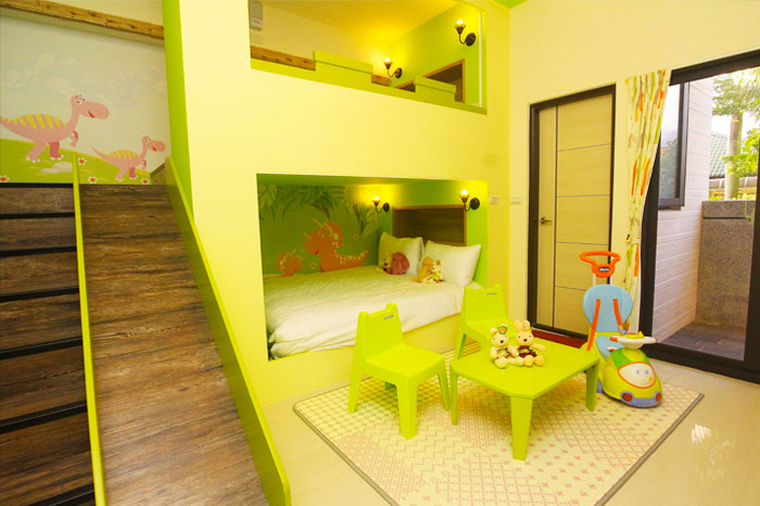 房型簡介 大自然的綠色系為主,搭配可愛小恐龍壁貼及木色地板,打造讓人自然放鬆的氛圍